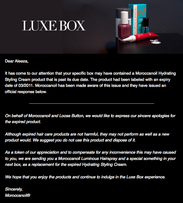 So if you read my blog post or watched my video on my November Luxe Box, you'll know that I (as well as others) received an expired Moroccanoil styling cream. I contacted Loose Button and above is the email I received regarding it.
