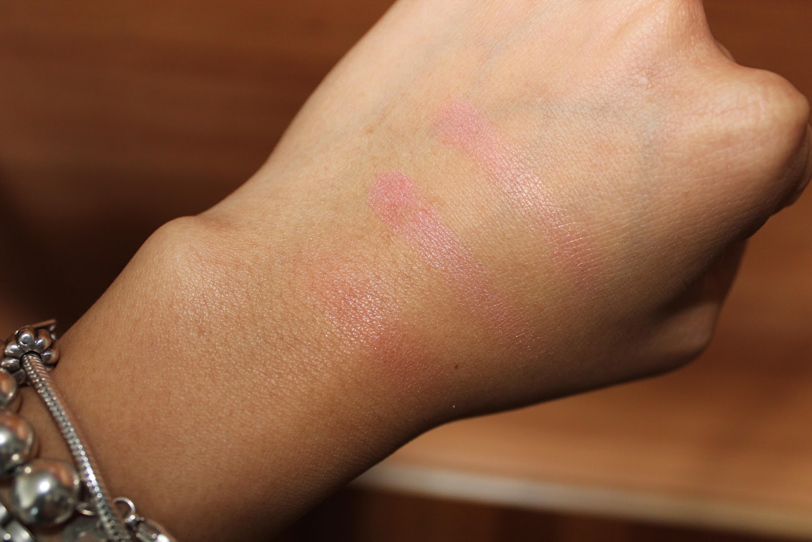 Left to right: all colours swirled together, just the pink half, and just the peach half. Apologies for the rushed swatches :).