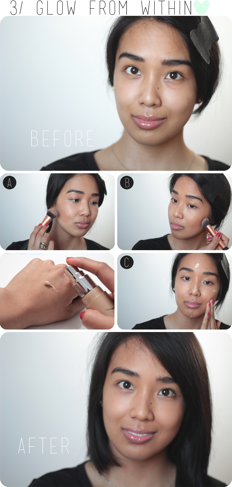 I've tried this method with many different foundations and tinted moisturizers, but it works best with creams and liquids with light-to-medium coverage. You want to use something that will allow the bronzer to shine through slightly.
