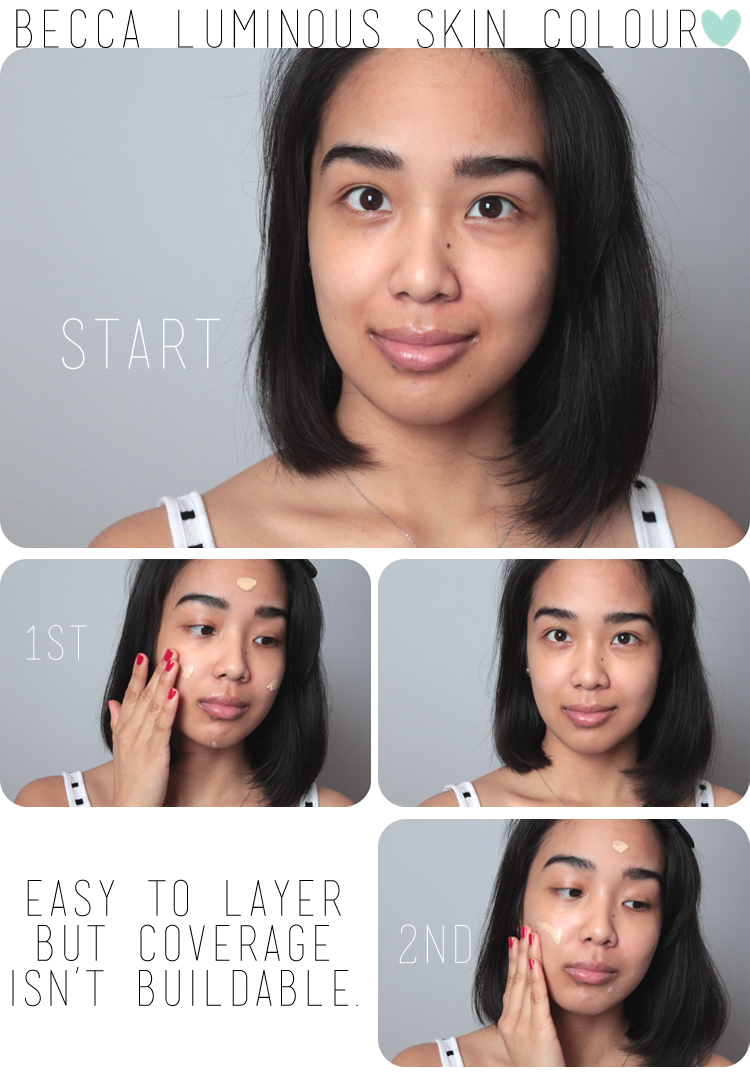 The Becca Luminous Skin Colour is easy to layer, but the coverage isn't buildable. Also, it doesn't cover hyper-pigmentation, discolouration, or severe redness very well.