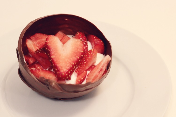 Instead of dark chocolate, I used Valentine's themed Hershey kisses. It was a little finicky to work with, but it held up well. As for the whipped cream, I forwent vanilla and only added a smidgen of sugar. I love the natural taste of fresh whipped cream. Then I topped it with some fresh strawberries.