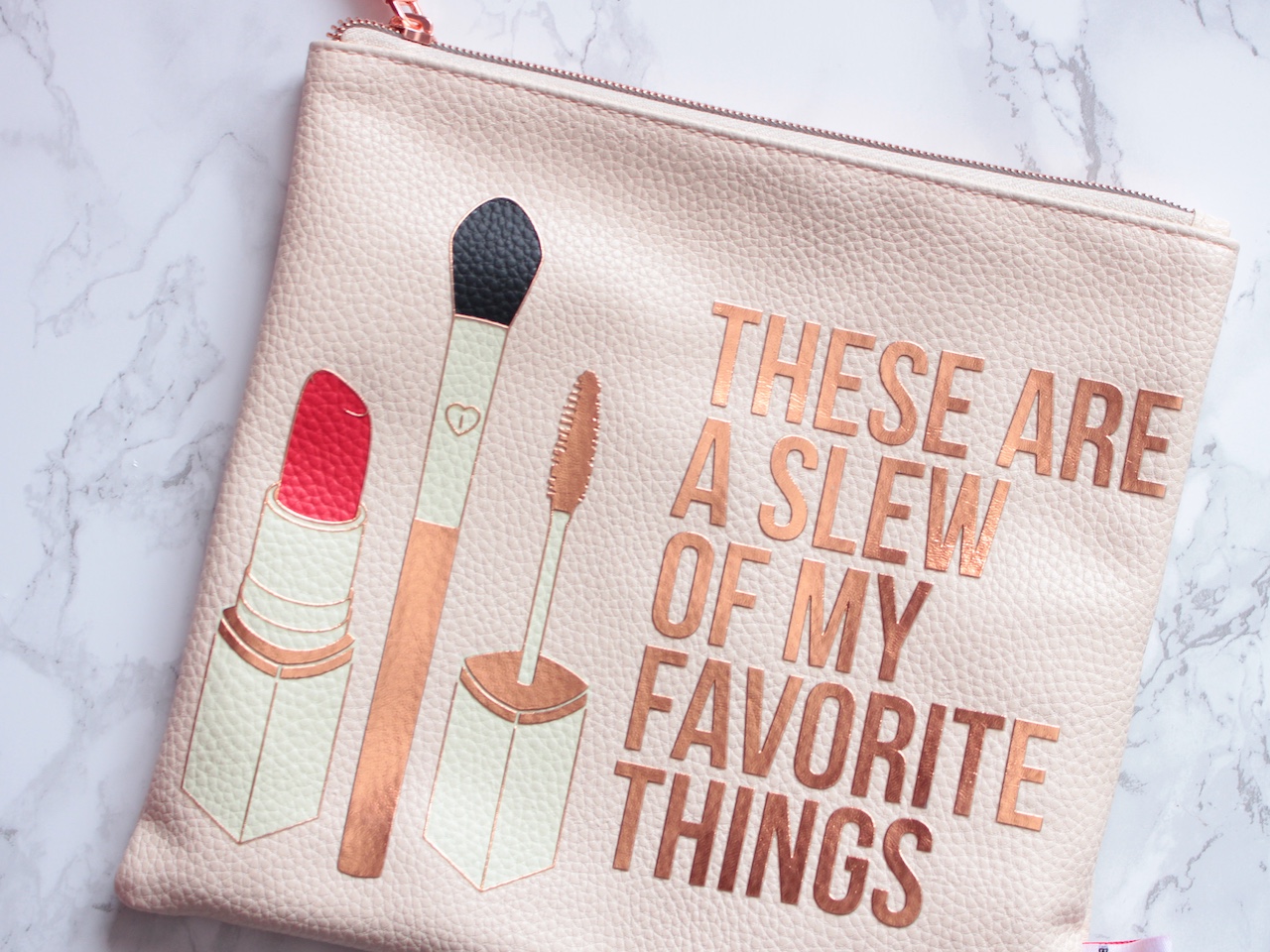I'm a sucker for makeup bags, especially ones that have cute slogans and rose gold details. This Breakups to Makeup Holiday Bag, which I picked up on sale for a steal, is my new favourite keep-all for the random bits I house in my purse. Aside from the adorable illustrations, surprisingly sturdy faux leather, and appropriate motto, there's nothing really special about it, but in my bag it lies, holding more than a slew of my favourite things. How apropos, right?